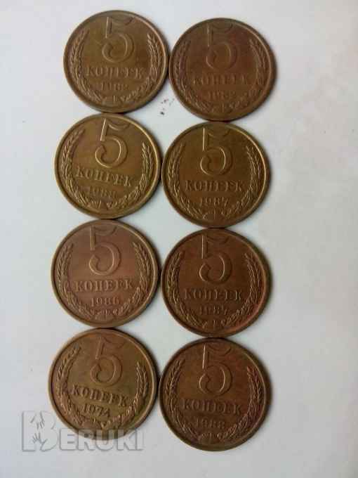 Монеты 5 коп СССР: 1980г - 1 шт, 1982г - 1 шт, 1986г - 1 шт, 1987г - 1 шт, 1988г - 2 шт, 1989г - 2 шт, 1990г - 1 шт.