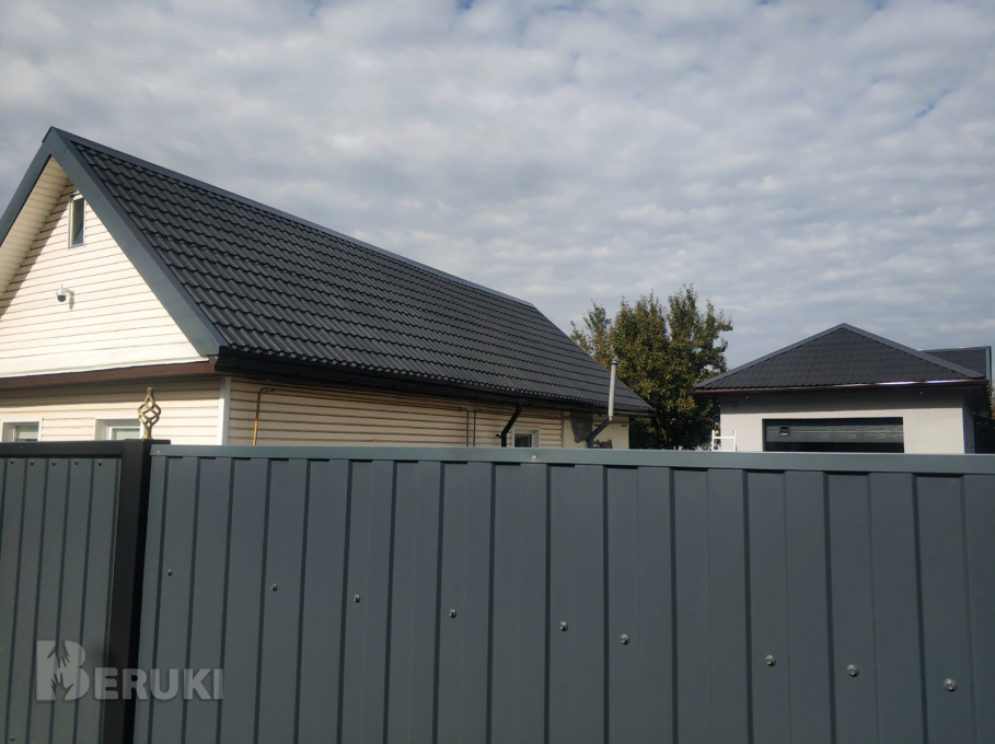 В наличии постоянно четыре цвета: шоколадный, серо-коричный, графитовый, черный. Реализуем для монтажа крыши доборные элементы, пленки подкровельные, ленты карнизные, саморезы.