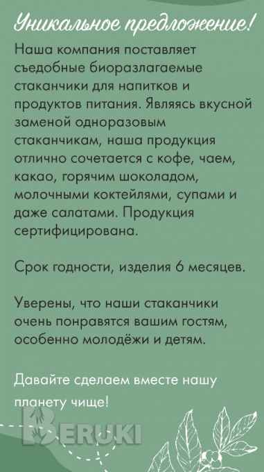 Компания реализует Стаканчики съедобные для кофе и других горячих напитков и продуктов по оптовым ценам.