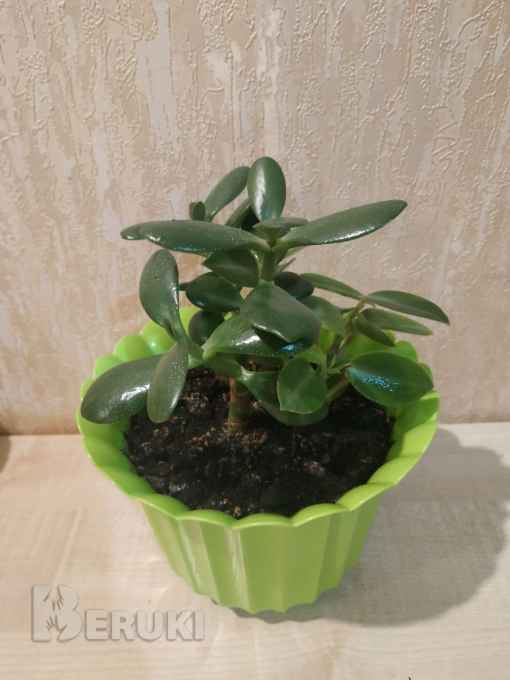 Высота 15 см. Толстянка очищает воздух, легко размножается через посадку листочков в почву, неприхотлива в уходе.