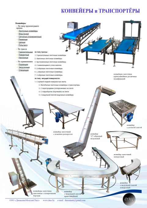 • горизонтальные ленточные конвейеры• наклонные ленточные конвейеры• крутонаклонные ленточные конвейеры• с изменяющимся углом наклона• Z-образные ленточные конвейеры• V-образные ленточные конвейеры с прямой гладкой поверхностью ленты желобчатые ленточные конвейеры и транспортеры с перегородками (поперечинами) на ленте с гофробортом (бортиками) на лентес модульной лентой модульные конвейерыи др.