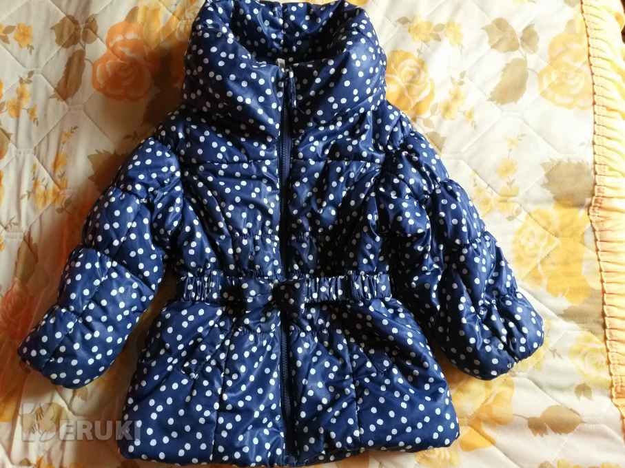 Куртка синяя в горохи с воротником высоким на 2-3года, б.у, в отличном состоянии, пояс на резинке и кнопке.