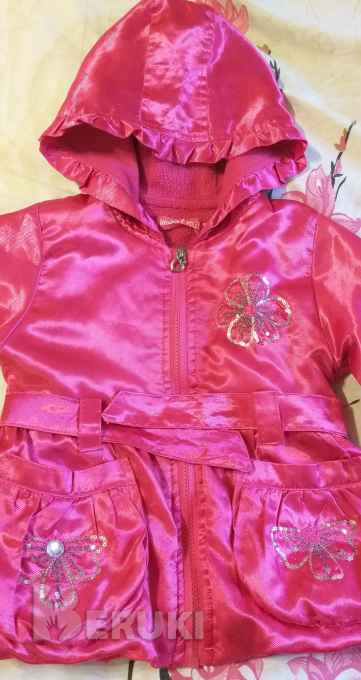 Куртка-ветровка малиновая лёгкая на 2-3года (р.86-98, весна), б.у в хорошем состоянии, с пояском и капюшоном, длина-45см, полуобхват груди-33см, длина рукава-34см.