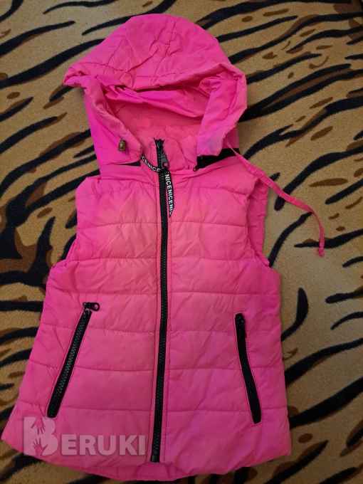 Куртка-жилетка розовая с капюшоном на девочку 2.5-4г, б.у в отличном состоянии. Полуобхват груди-32см, длина изделия-42см.