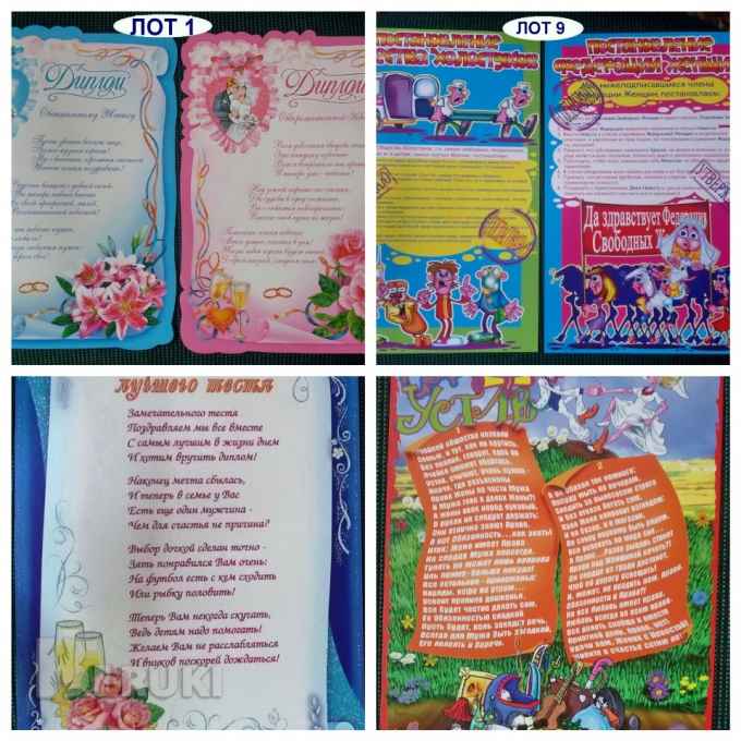 Свадебные дипломы 12шт –для жениха и невесты, свекрови и свёкру, тёще и тестю, невестке и зятю, невестке и жениху, свекрови, свадебный устав, постановления общества холостяков и федерации женщин. Размеры дипломов: 20-30см, 19,5-29см, 20-27см. Свидетельство о браке-в подарок.