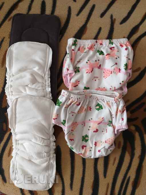 2)Многоразовые толстые моющиеся подгузники: 1шт черный (размер 32-14см) и 2шт белых (одна сторона не промокаемая размер 27-12см в нерастянутом виде), пару раз пользовались, т.к были другие. Состояние отличное, аккуратные.