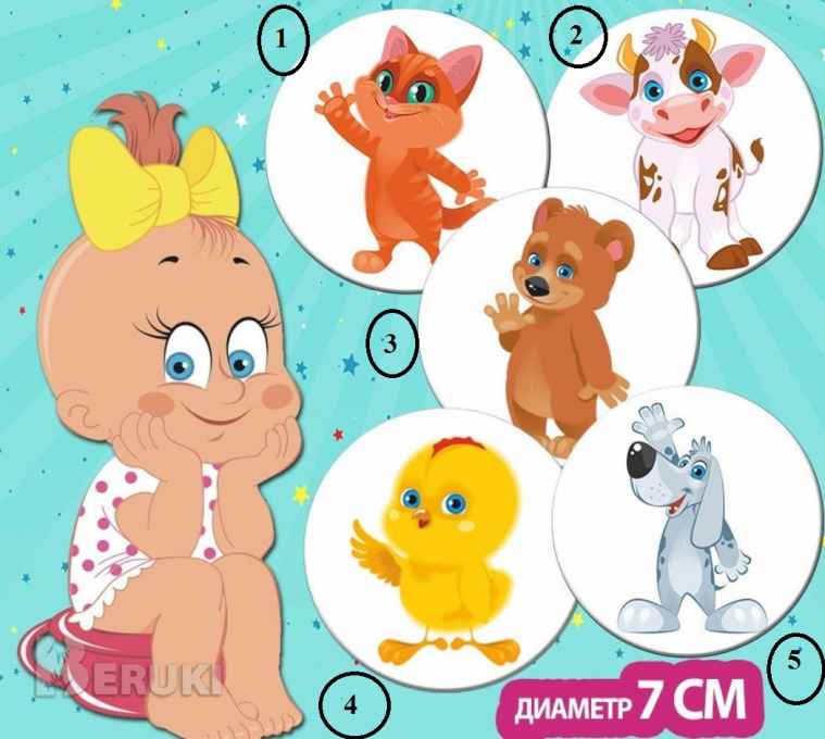 Наклейки для приучения к горшку, новые проявляются, когда малыш делает свои дела в горшочек: КОТ, КОРОВА, МИШКА, ЦЫПЛЕНОК, ВОЛК, СОБАКА, УТЕНОК, ЗАЙКА, ОБЕЗЬЯНКА, СЛОН.
