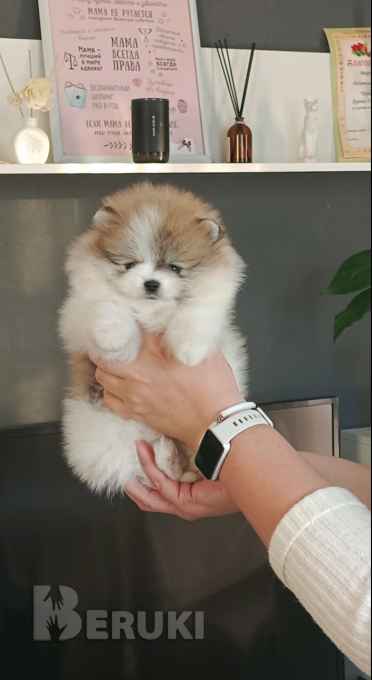 Предлагаем девочку померанского шпица окраса пати колор. Родничка нет, грыжи нет, зубки норма. Оба родителя имеют родословные и выставочные оценки. Мама 22 см в холке, папа 19 см. На последнем фото родители .Предполагаемый вес во взрослом возрасте до 2.5 кг. На момент продажи будет сделана:
