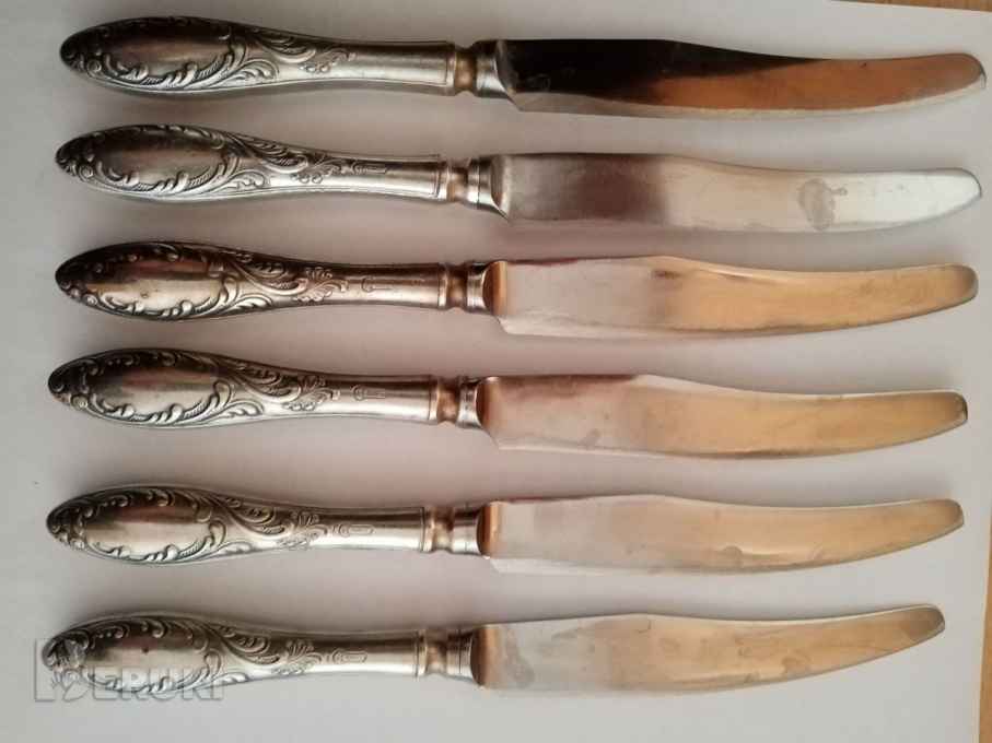 6 ножей кухонных, мельхиоровых, длина 21 см, есть клеймо на ноже нмц, можно прочесть.За все 6 ножей 85,00 руб.