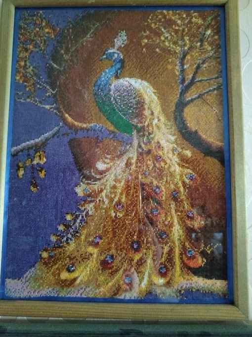 Картина, вышивка, мулине, люрекс, крест, рамка, стекло, р-р 33х43,,, Павлин"