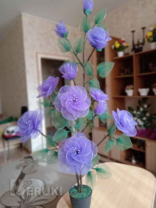 Высота 110-120 см. Диаметр цветов 18-20 см. Сделаны из ткани фатин. Стоимость 40 - 50 р.