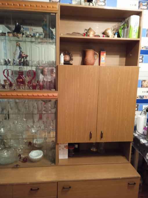 Продам секцию в хорошем состоянии. Есть все необходимое для хранения, шуфлядки маленькие, одна большая,застекленный шкаф с полками, и второй шкаф с полками