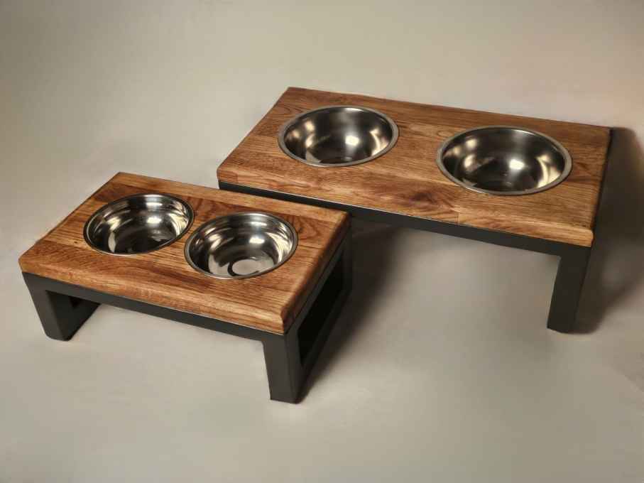 Подставка под миски для собак. Ручная работа, выполнена из металла и массива дуба, массив дуба покрыт маслом, миски из нержавеющей стали идут в комплекте.