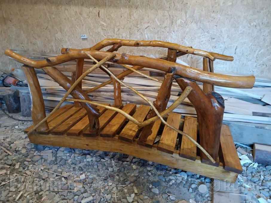Садовый мостик. Основание и ступеньки - сосна, перила - яблоня, покрытие - пропитка "грецкий орех" и лак. Длина 216 см, ширина ступенек - 78 см. Находится в г.п. Плещеницы Логойского района.