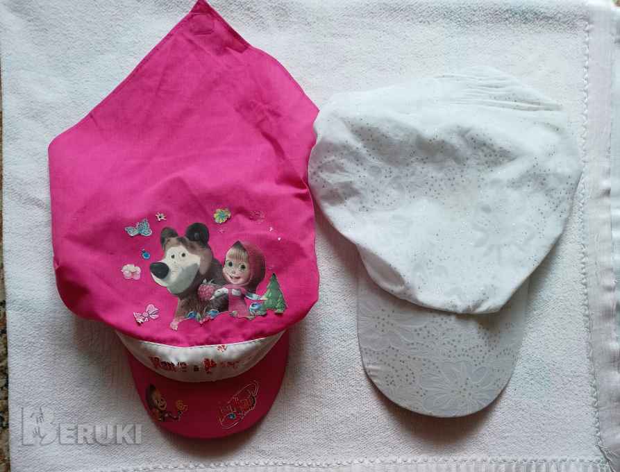 Кепки 2 штуки для девочек , 51-52 размер , розовая х\б "Маша и медведь" , а белая х\б с рисунком и блеском , сзади на резинках , на диаметр головки 20 см , в то лето надели по 3 раза и теперь стали малы , вышлю любой почтой , смотрите мои другие лоты .