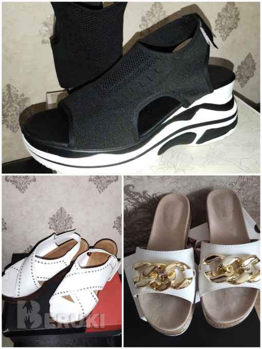 2)Босоножки р-р 39-40 текстиль -стрейч,черные,чёрно-белая танкетка,лёгкие.-Турция.