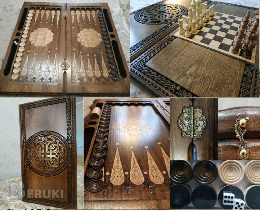 В комплекте:Чехол, кубики (зары),Шашечные и шахматные деревянные фигурки на войлочной основе.