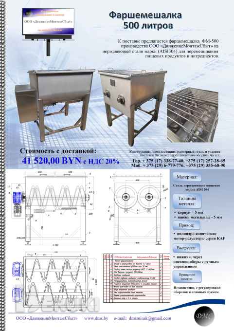 Фаршемешалка 500 литровК поставке предлагается фаршемешалка ФМ-500 производства ООО «ДвижениеМонтажСбыт» из нержавеющей стали марки (AISI304) для перемешивания пищевых продуктов и ингредиентов.Материал: Сталь нержавеющая пищевая Марки АISI 304Толщина металла: корпус - 5 мм , шнеки месильные - 5 ммПривод: цилиндро-коническиеМотор-редукторы серии KAFВыгрузка: • нижняя, через пневмошиберы с ручным управлениемВращение шнеков: Независимое, с регулировкой оборотов и плавным пускомКонструкцию, комплектацию, размерный стиль и условия поставки Вы можете дополнительно обсудить по тел.