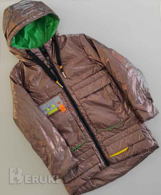 Эта удлиненная куртка предназначена для поздней осени и зимы. Она выполнена в коричневом цвете с блестящей текстурой, что придает ей стильный и современный вид. Внутренняя подкладка ярко-зеленого цвета добавляет контрастности и делает куртку более заметной.