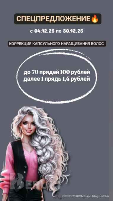 Спецпредложение в Минске действует 04.12.25 - 30.12.25 наКОРРЕКЦИЮ КАПСУЛЬНОГО НАРАЩИВАНИЯ ВОЛОС. 1).Фиксированная стоимость:*70 прядей 100 рублей;*далее 1 прядь 1,4 рублей;2).Используем микро и нано-капсулы.3).Бережное и безопасное выполнение процедуры.4).Индивидуальный подход.