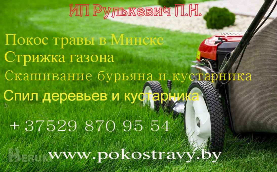 Покос травы в городе Минске, районе и области.Стрижка газона в Минске и иные мероприятия по его обслуживанию (аэрация, скарификация)Скашивание бурьяна, поросли, кустов.Спил деревьев и кустарника.Подготовка участка под строительство или к продаже.