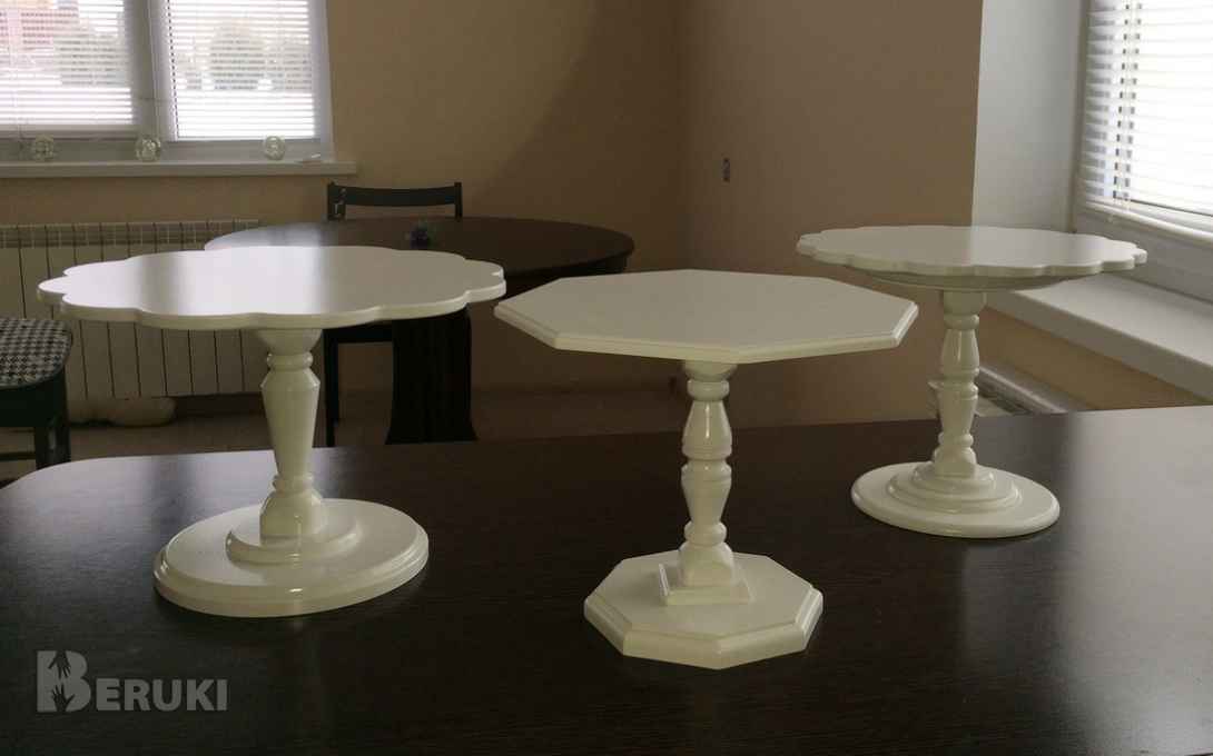 Тортница (собственное производство) изготовлена из дерева и МДФ. Размеры: высота 20 см, диаметр вверху 28 см, внизу 15 см. Можно приобрести неокрашенное изделие (два последних фото) за 33 рубля.