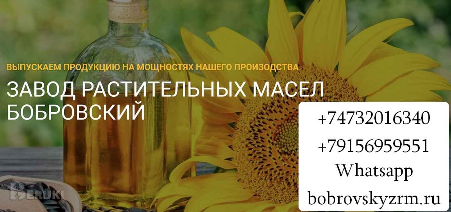 Завод растительных масел Бобровский - одно из крупнейших предприятий Воронежской области, основано в 1895 году.Основное производство (ЗРМ) Завода растительных масел «Бобровский» расположено в Воронежской области г. Бобров. На сегодняшний день ЗАО ЗРМ «Бобровский» является российским производителем подсолнечного масла. Отличительная особенность нашего предприятия - высокое качество, натуральность, экологическая чистота. Филиал Завода «Бобровский» - Склад-Цех, ведет производственную деятельность по расфасовке подсолнечного масла в ПЭТ бутылки с 1990 года.Адрес Филиала ЗАО ЗРМ «Бобровский» : Московская область, Орехово-Зуевский район, д. Кабаново.Подсолнечное масло «ЛИРА» - это отборное масло первого отжима, вырабатываемое только из отечественного подсолнечника. Универсальное масло – подходит для жарки, заправки и консервирования!Среднесписочная численность работников общества 142 человек.Предприятие в год перерабатывает более 40 тыс.тонн подсолнечника. За год производство масла составляет - 16 тыс.тонн, прессового жмыха - 15 тыс.тонн.Рады вам предложить:Приглашаем Вас к сотрудничеству и предлагаем продажу подсолнечного масла крупным оптом (от 20 тонн), с доставкой и самовывозом.Склад расположен в Московской области , Орехово-Зуевском р-оне, д. Кабаново .Масло подсолнечное рафинированное дезодорированное вымороженное ТМ "Лира", ГОСТ 1129-2013Фасованное в бутылку ПЭТ емкостью :- 1 литр (масса 0,92кг)- 0,9 литра (масса 0,828 кг)– 5 литр (масса 4,6 кг)Наливом- в кубах (950 кг.),- флекситанк (22 тонны)Масло подсолнечное нерафинированное первый сорт ГОСТ 1129-2013- наливом в кубах (950 кг.),- флекситанк (22 тонны)Качество подтверждено соответствующими сертификатами и полностью соответствует требуемым стандартам.Доставка по Казахстану, России, странам СНГ и Центральной Азии.Звоните и оформляйте заказ уже сегодня!Сотрудничаем с агентами!География продаж: Россия, СНГ, зарубежье