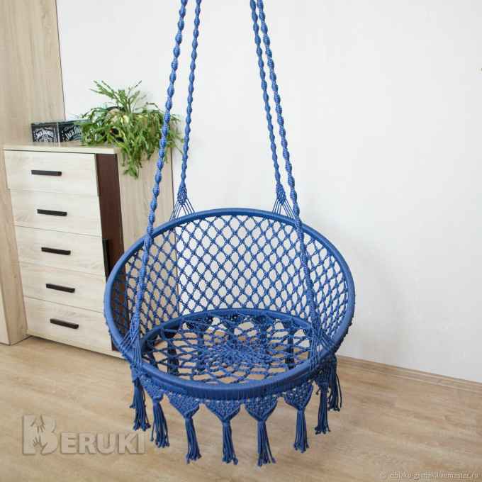 Подвесное кресло-гамак выполнено в технике макраме ручной работы! Идеально дополнит интерьер вашего дома, сада или терассы. Кресло изготовлено из высокопрочного гамакового шнура. В основе металлические кольца. Богатая цветовая гамма. Выдерживает нагрузку до 150 кг., не растягивается,не боится ультрафиолета и дождя. Прекрасно моется и быстро высыхает.Может быть выполнено под заказ в нужном цвете