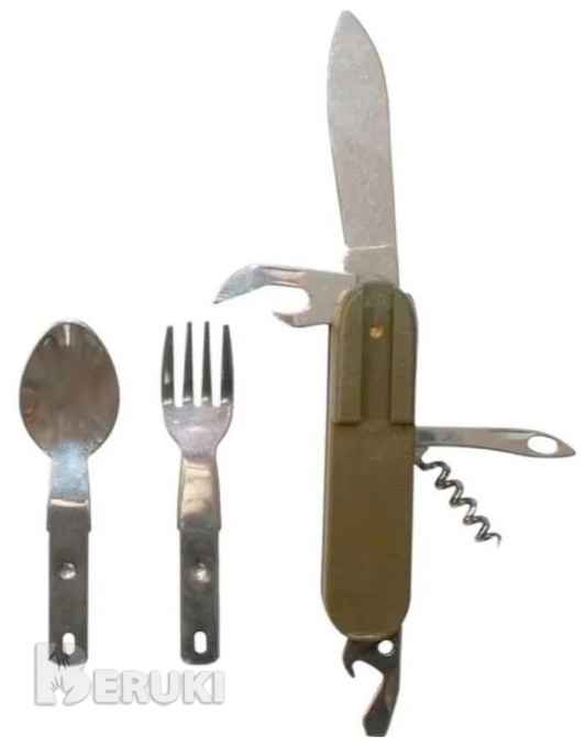 Набор столовых приборов походных (7-в-1 в чехле) из нержавеющей стали (зеленый цвет). Размер в сложенном виде: 100*5ммКомплектация: ложка, вилка, нож (2 шт), открывалка, штопорИдет без чехла, в белой коробкеНовый