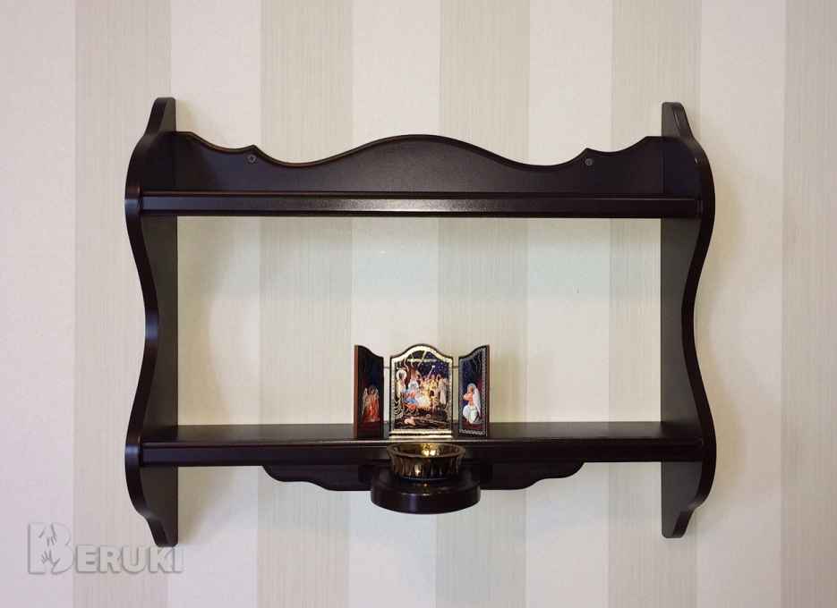 Полка настенная (собственное производство) изготовлена из МДФ. Размеры: длина 50 см, высота 36 см, глубина 13 см. Расстояние между полками 20 см. При желании длину можно увеличить до 70 см.