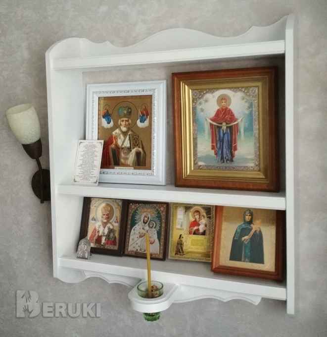 Полка настенная трёхъярусная с отверстием для лампады (собственное производство) изготовлена из дерева и МДФ, загрунтована и окрашена. Размеры: длина 60 см, высота 52 см, глубина 14 см, расстояние между полками 14 и 22 см. Расстояние между полками можно изменить. Крепление к стене предусмотрено. Можно приобрести неокрашенное изделие (последнее фото) за 95 руб.