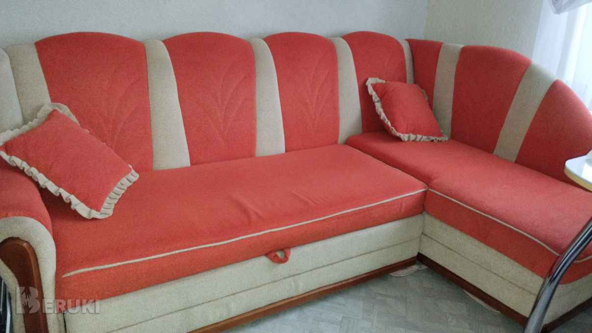 Диван угловой в хорошем состоянии текстиль .Два пуфика .две подушечки. Размер 150/220 угол правый не переставляется.