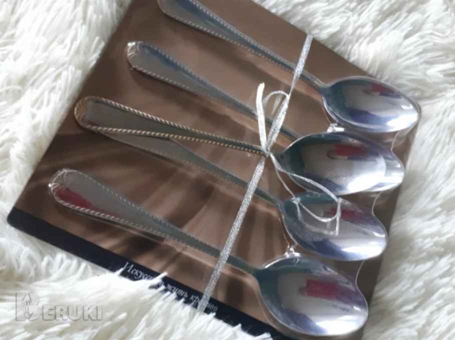 Красивый богатый цвет хром+золото, в интернете от 35 до 80 рублей! Нержавеющая пищевая сталь. Набор из 5 ложек, так как 4 не дарят, если Вам на подарок!