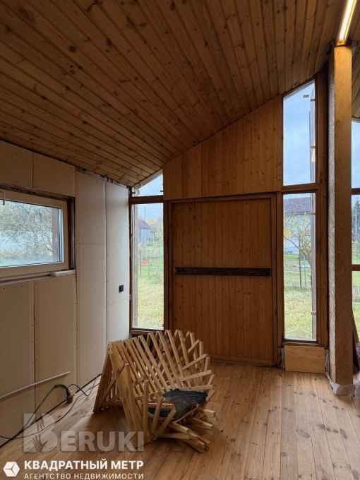 Общая площадь 44 м2, внутри отдельное помещение под сан.узел 4.0 м2. Установлен печь-камин, бойлер ElectroLux, насос для воды. Разведены коммуникации по дому, необходимо завершить и сделать внутреннюю отделку.2-ой дом -студия, деревянный 2016 года постройки, общая площадь 35 М2, фундамент бетон, крыша еврошифер, полы - ДВП, окна-деревянные. Можно использовать для проживания, либо хранения хоз.инвентаря.