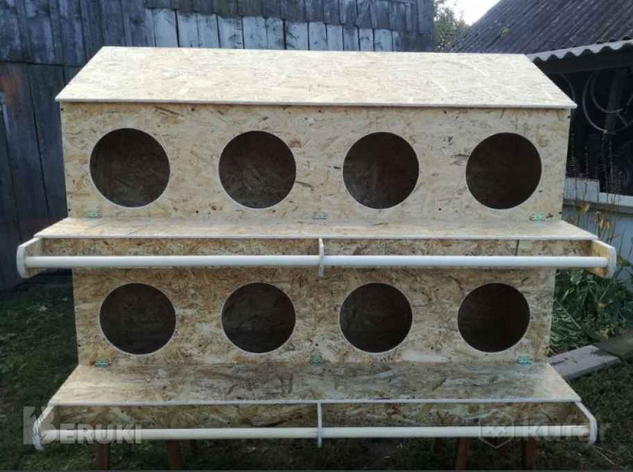 Внутренние размеры гнезда 40х40х40 см. Спереди имеется большой и удобный лоток для сбора яиц, закрытый крышкой. Пол внутри сделан с небольшим наклоном для скатывания яйца. Все гнезда, как и лоток для яиц, раздельные. Для удобства захода в гнезда, спереди установлена круглая взлетно-посадочная перекладина.