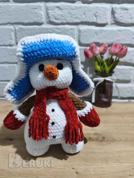 Мягкая игрушка Снеговик. Шапка ушанка, шарф и варежки снимаются.