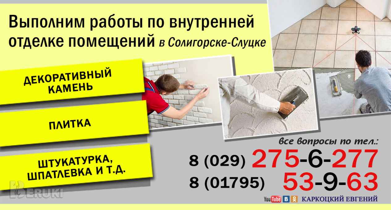 Выполним работы по внутренней отделке помещений в Солигорске-Слуцке(плиточные работы, декоративный камень, штукатурка, шпатлёвка и т.д.)Качественно и в срок!Нал, Безнал.Все фото по отделке можете просмотреть в одноклассниках, а также в контакте, -Евгений Каркоцкий, Слуцк.https://vk.com/slutskplitka
