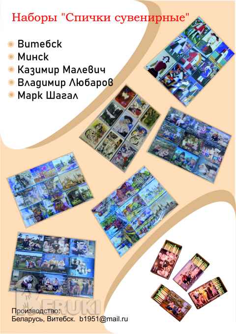 Предлагаю от производителя наборы спичек сувенирных Минск, Витебск, Мирский замок, В.Любаров, К.Малевич,Шагал(с разрешением). Упакованы методом целлофанирования. Опт, доставка. Цена по запросу. Оплата по договоренности.