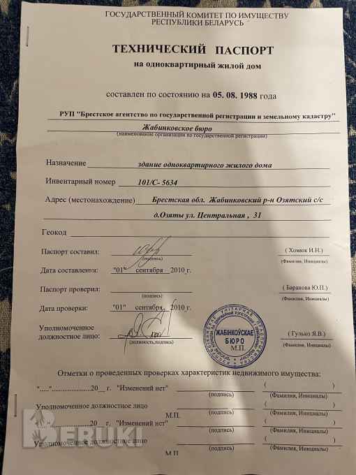 Продается дом с участком в аг. Озяты, с отлично развитой инфраструктурой (асфальтированная дорога от самого дома до райцентра Жабинка, обл. центр Брест, г. Кобрин, трасса М1), поликлиника в которой даже стоматолог, церковь, два магазина, беларусбанк, белпочта, детский сад, в соседней деревне школа. Пилорама, сельхоз предприятие подчиненное Брестскому мясокомбинату. Ходят автобусы и маршрутные такси.В доме заменена электропроводка, электросчетчик, заменены окна. Две печки, которые хорошо работают. К дому поведен газ Во дворе колодец, хороший большой сухой погреб. Рядом грибные и ягодные леса, хорошие места порыбачить, так-же и поохотиться на дичь. Хороший вариант для агроусадьбы или для занятия сельхоз бизнесом.
