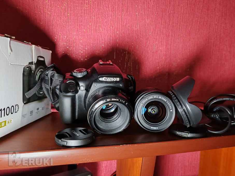 Фотоапарат Canon 1100D, объектив Kit 18-55, на него в подарок 3 световых фильтра в чехле, бленда
