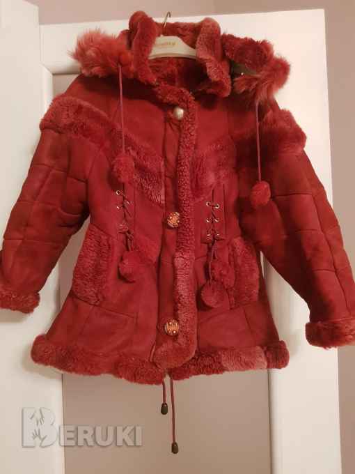 Дубленка детская, натуральный мех, на возраст от 3 до 5 лет. Капюшон отстегивается, длину рукава можно регилировать манжетом, рукав реглан. Застегиваеся замком и 3 пуговицы, внизу можно подтянуть кулиской. Цвет малиновый. Почта, европочта